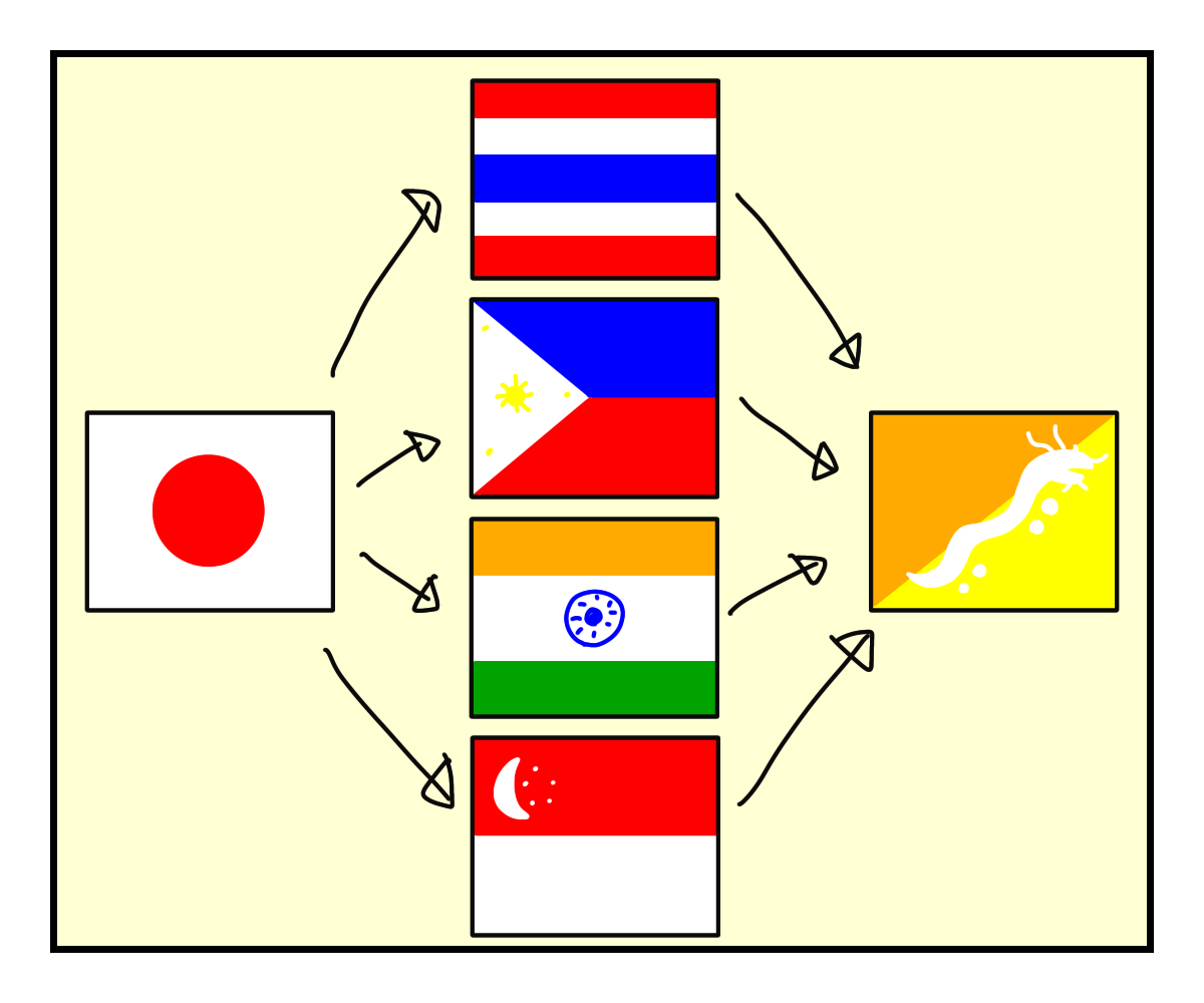 タイ、ネパール、インド、シンガポール、フィリピンなどの国を経由することになります。