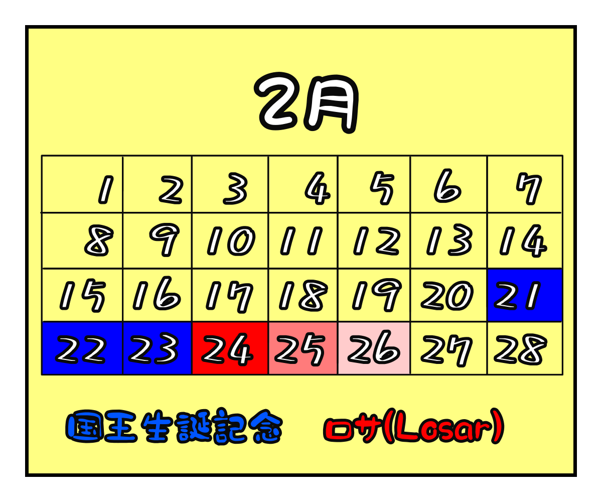 また、2月21日〜23日は国王の生誕記念の祝日であり、この時期はごっそり大型連休となります。