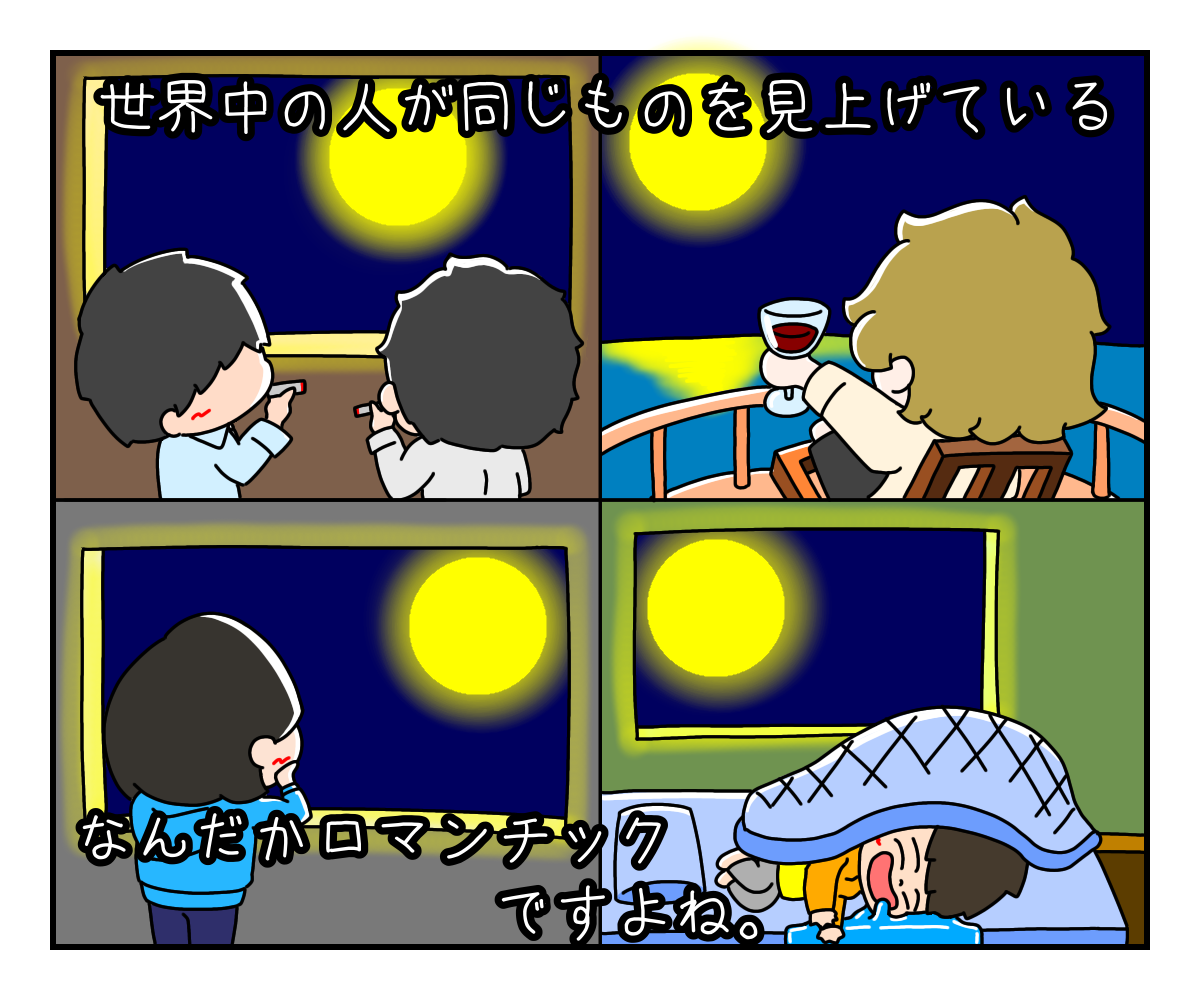 【漫画】中秋の名月〜海外での月の見え方〜 2021年09月21日 19:00 本日は中秋の名月ということで、描いてみました。今回描いたもの以外にも、月の模様の見え方には多くの解釈があるようです。中国なんかではヒキガエルの頭と前足という解釈があるようですが、どう頑張っても僕には見えませんでした( ̄∇ ̄)まあそれは置いておいて、世界で比べてみると面白いですよね。また、ブータンの夜は最近かなり冷え込み、星が綺麗に見えます。 今夜の月が楽しみです♪ スポンサーリンク 「漫画」カテゴリの最新記事 「海外生活」カテゴリの最新記事 < 前の記事次の記事 > コメント コメントフォーム 名前 コメント 記事の評価 リセット リセット 顔 星 情報を記憶 コメントを投稿する スポンサーリンク