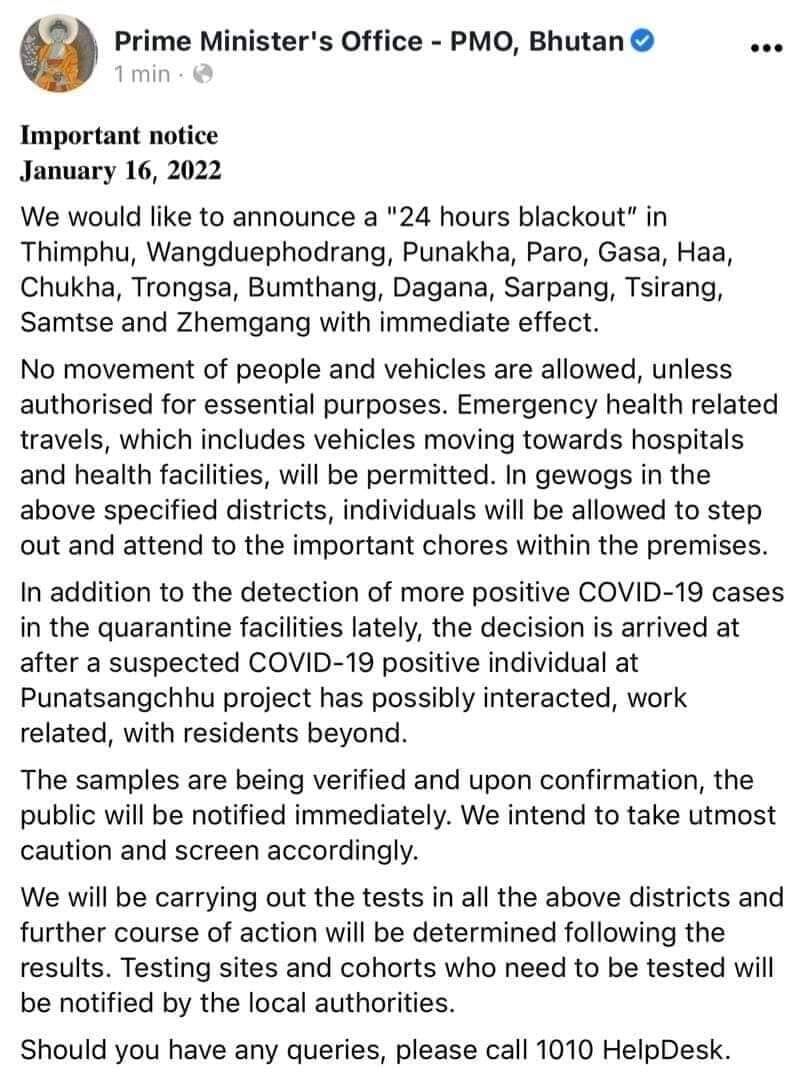 内容は、首都ティンプーを含めた14の県で、24時間のブラックアウトを発表する。
