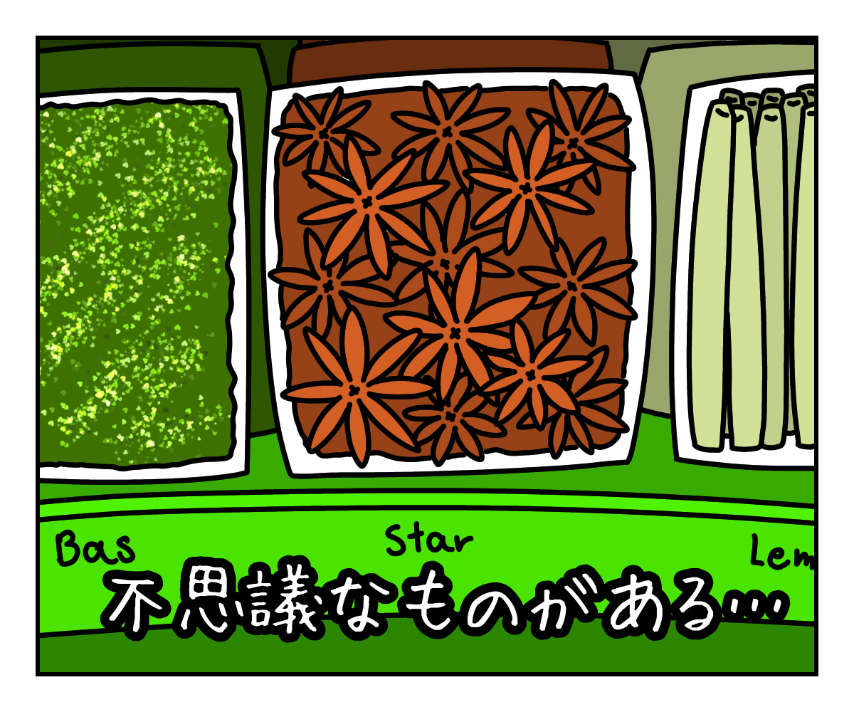 少し調べたらレモングラスはタイ料理、特にトムヤムスープなんかの香り付け。スターアニスは中華料理の香り付けに使われることが多いようです。