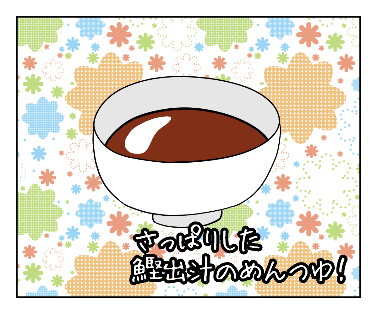 腰のある細麺ももちろんいいのですが、なんと言ってもあの鰹出汁のめんつゆの味!
