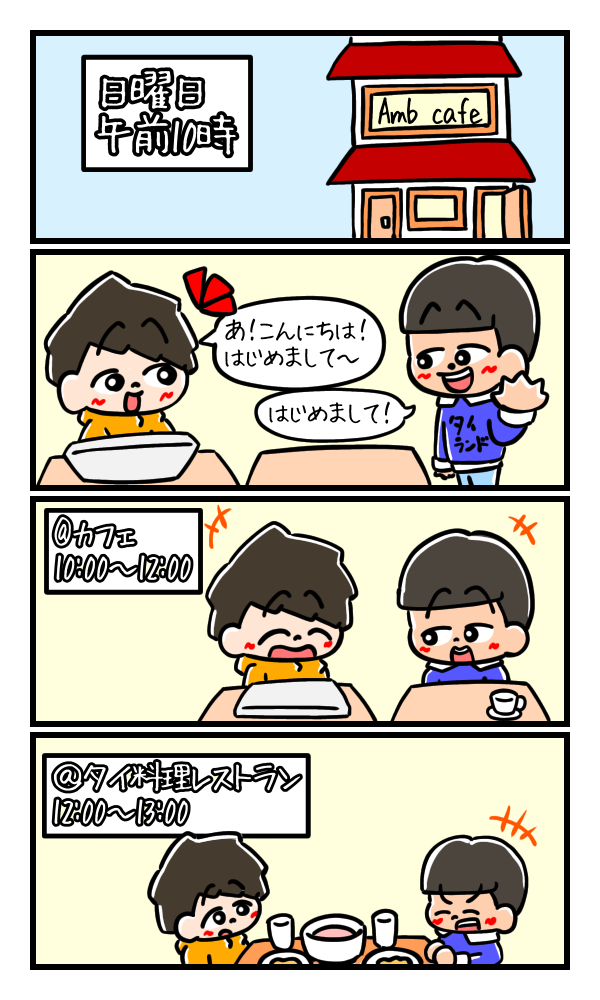彼とは日曜日の午前10時頃に会って、カフェで話をしてからランチを食べに行きました。ブータンにあるタイ料理のお店です。その後少し街案内をしてから、朝とは別のカフェでデザートを食べながら話をして、解散しました。時間にしたら5時間ほどでしょうか。