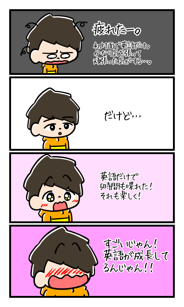 だけども、全く知らなかった外国人と2人だけでこんなに長時間過ごしたのは初めてで…。こんなにも長時間かけていろんな話を英語だけでできたというのが、僕にとってはすごく嬉しかったです。大きな自信になった気がします。すごくいい勉強になりました。