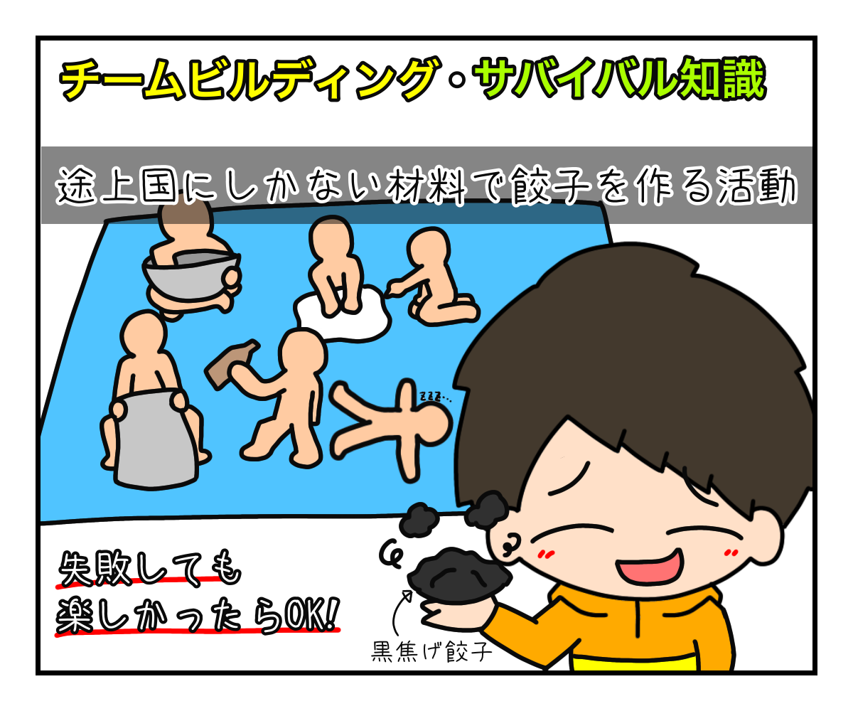 時には、途上国にしかない材料を使って餃子作りにチャレンジしたり。