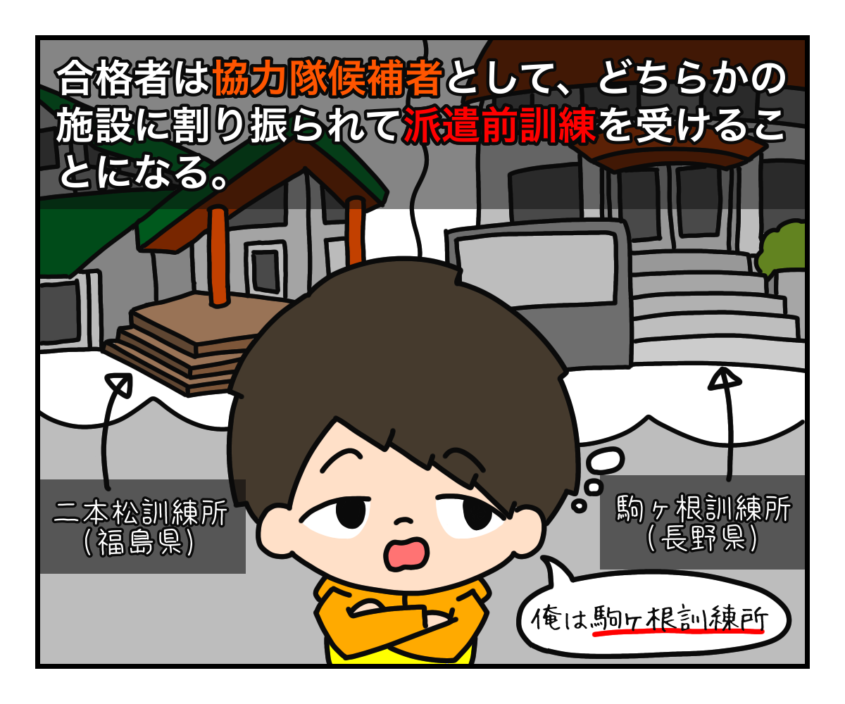 世界中に派遣される候補者たちが、長野県にある駒ヶ根訓練所と福島県にある二本松訓練所の二箇所にわかれて、70日間の研修を受ける。