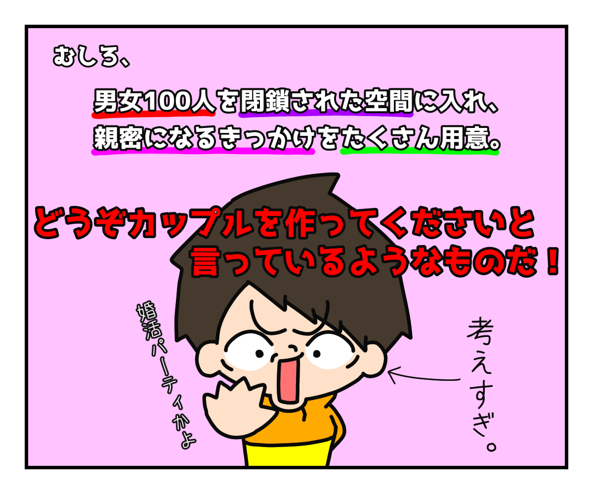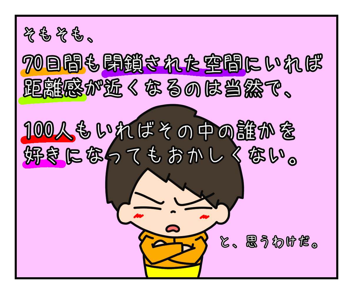 そりゃ、70日間も閉鎖された環境で同じメンバーといれば、距離感が近くなるのは当然で、100人もいるんだから、その中に好みの異性がいてもおかしくない。