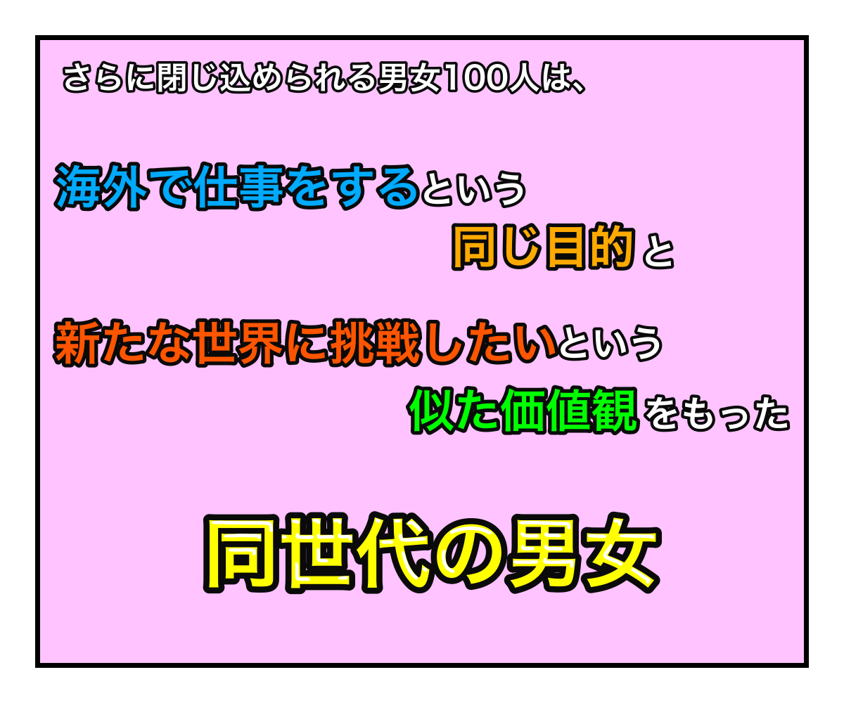 そんな場所で「海外で仕事をする」という同じ目的と「新たなことに挑戦したい」という似たような価値観をもった、同世代の男女100人が共同生活をする。