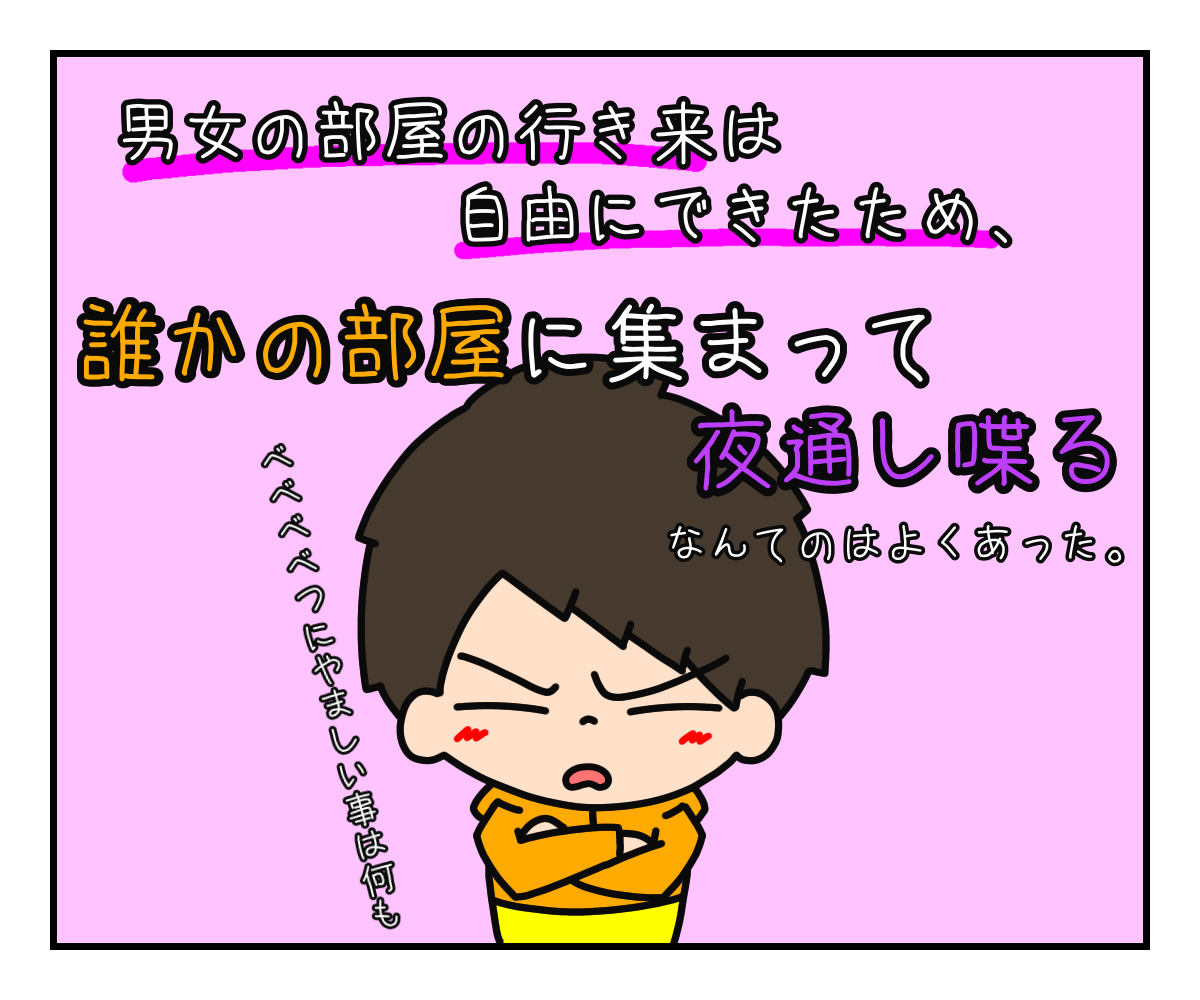 それに付き合っていないにしても、男女関係なく夜通し部屋で喋ったり、お互いの部屋を行き来なんてのはよくあった。
