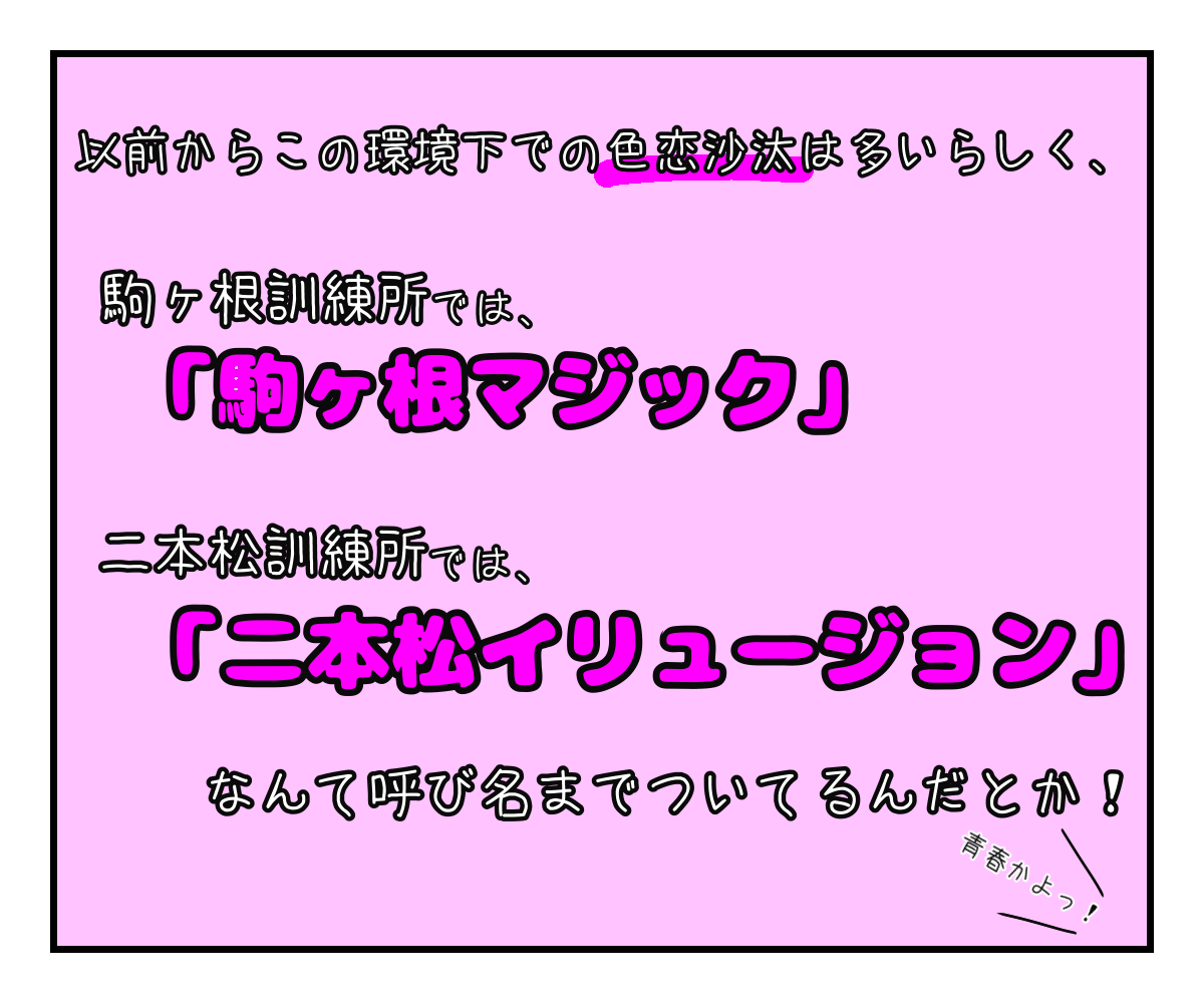 駒ヶ根訓練所では「駒ヶ根マジック」、二本松訓練所では「二本松イリュージョン」などと呼ばれているんだとか。